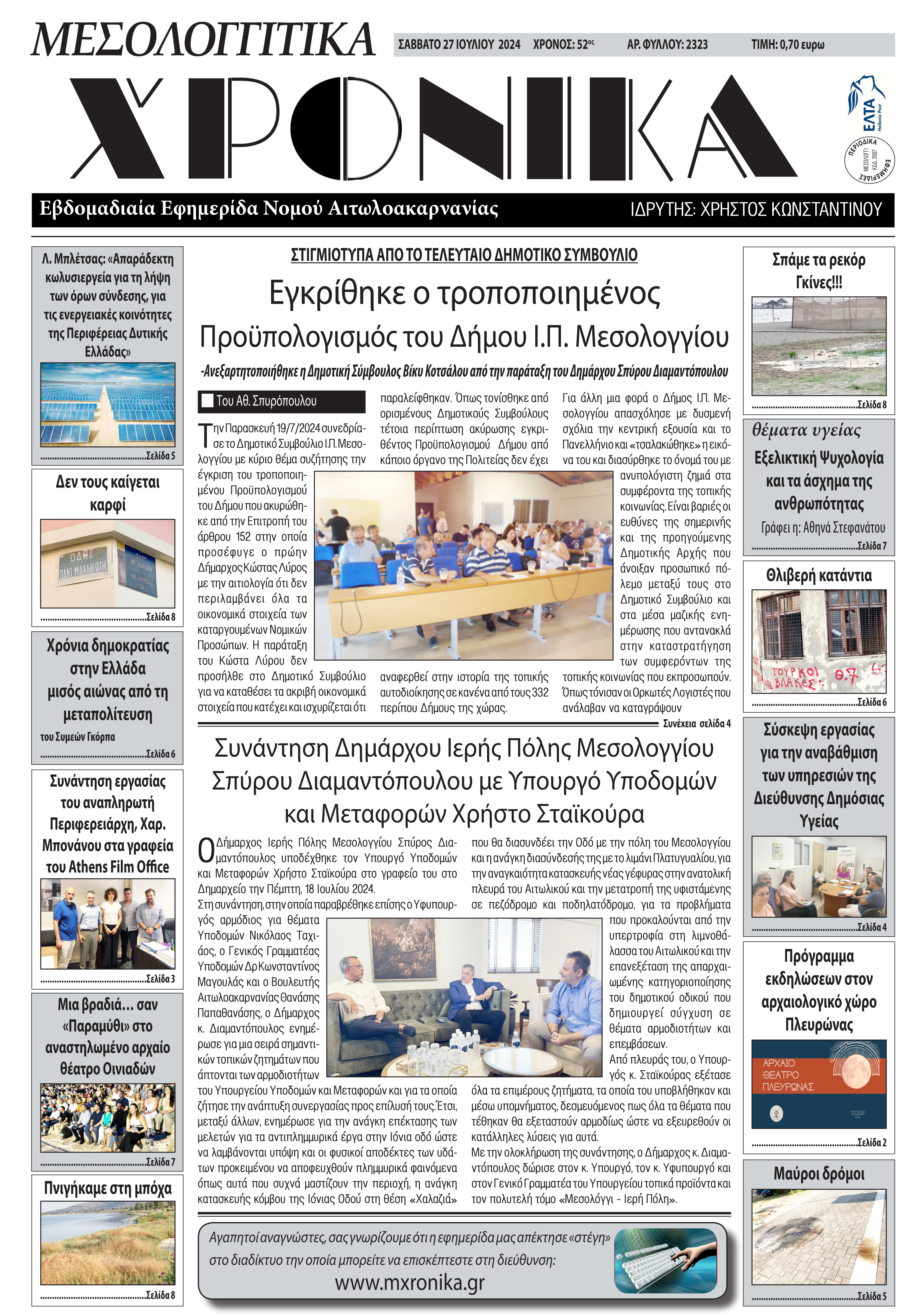 ΕΒΔΟΜΑΔΙΑΙΑ ΕΦΗΜΕΡΙΔΑ ΝΟΜΟΥ ΑΙΤΩΛΟΑΚΑΡΝΑΝΙΑΣ (e-mail : mxronika@otenet.gr) Kostis Stefanatos